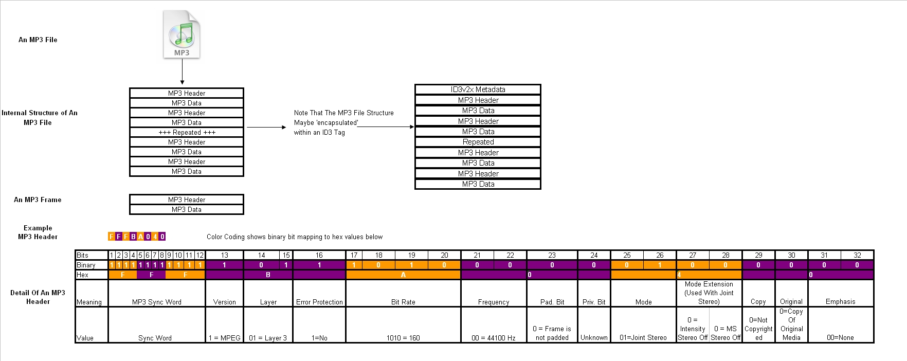 因此可以理解为,MP3文件=[ID3V2]+音频数据(Frame)+[ID3V1]。
