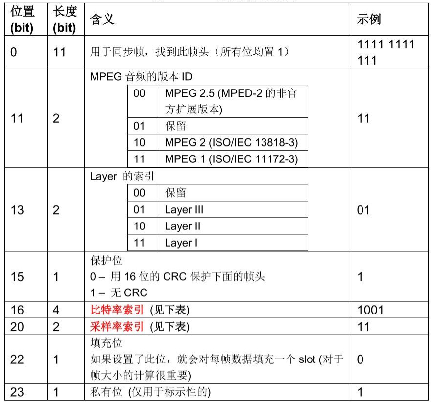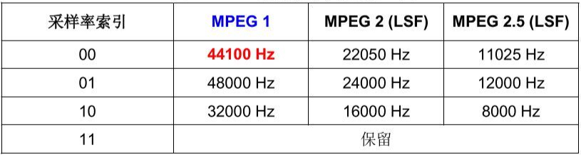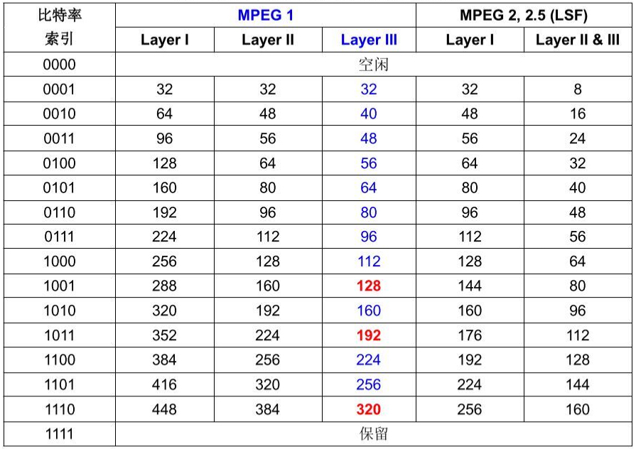 其中的比特率、采样率索引表如下(需要结合版本,比如常见的MPEG V1,L3):