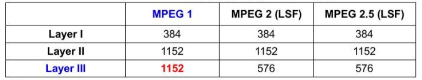 每个音频帧都是压缩后的音频数据,MPEG音频帧的每一帧的采样数都是固定的。具体数值参见下面图表: