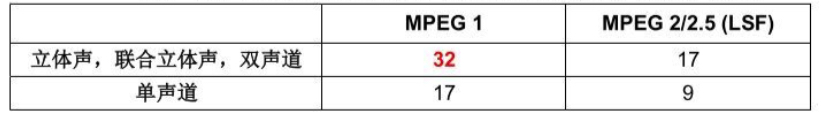 在MPEG-1 Layer III中,有些特定的比特率需要与特定的声道模式组合才可使用: