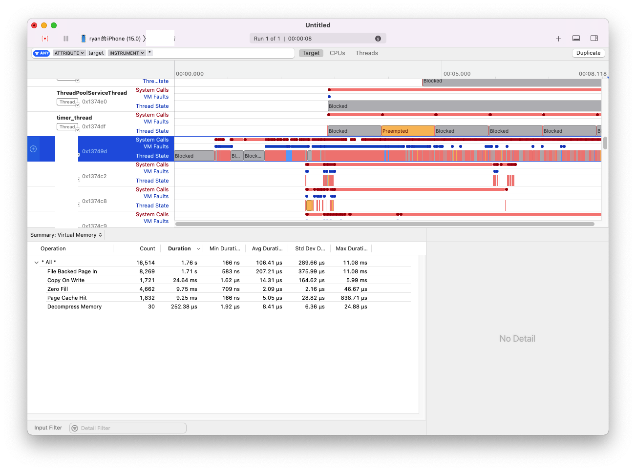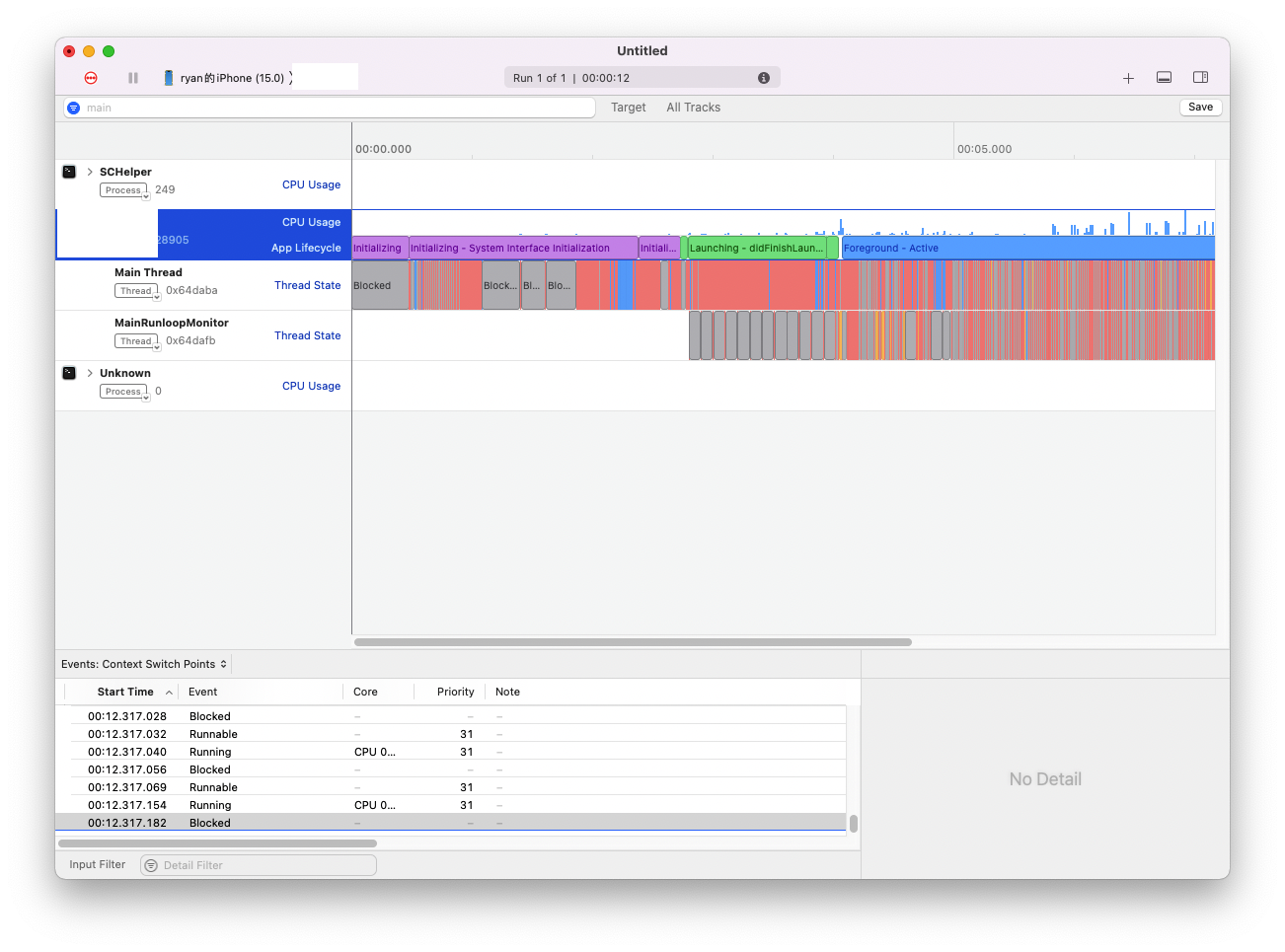 Instruments的性能检测需要结合Time Profiler、多线程状态、内存、系统日志等手段进行综合分析,尤其对于一些非稳定出现的问题。
