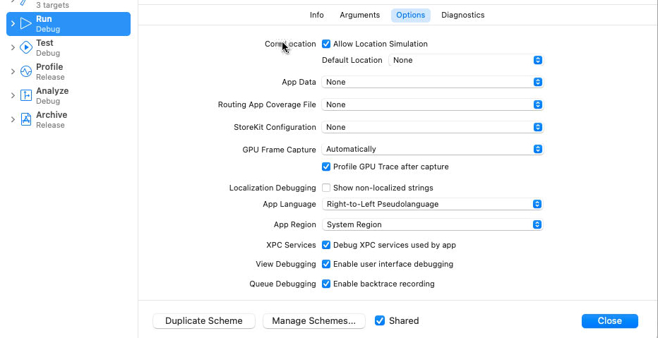 App按照系统语言来确定UI是否使用RTL。我们可以修改设备的系统设置语言,也可以修改Xcode中项目的启动参数。