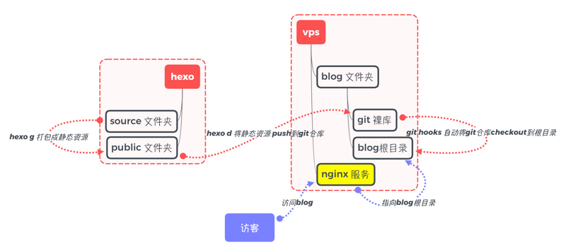 hexo在本地机器生成发布文件后,通过git推送到VPS上,并且VPS上的git仓库配置了git-hooks,在接收到git仓库更新后,将内容拷贝到web服务站点即可。